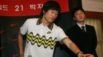 한국인 최초로 잉글랜드 프리미어리거가 된 박지성(맨체스터 유나이티드)이 25일 구단 신체검사를 마치고 귀국했다. 박지성이 인천공항 스카이 파라다이스 라운지에서 가진 공식 기자회견장에서 묘한 표정으로 앉아 있다./인천
