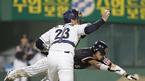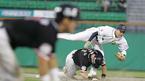 28일 잠실 구장에서 벌어진 두산 베어스와 롯데 자이언츠의 경기 롯데의 5회초 1사 1,3루서 유격수 땅볼을 친 강민호가 1루 주자 펠로우가 2루에서 포스아웃될 때 1루에 헤드퍼스트 슬라이딩으로 들어가고 있으나 결국 병살을 면