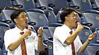 30일 잠실 구장에서 벌어진 두산 베어스와 롯데 자이언츠의 경기서 9회초 롯데가 두산에 3-1로 앞선 상황에서 롯데 응원단이 를 부르자 한 남성 팬이 먹던 아이스크림을 마이크 삼아 노래를 부르다(왼쪽 사진) 노래가 끝나자 마