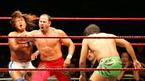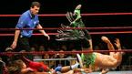 30일 저녁 서울 잠실체육관에서 벌어진 WWE 슈퍼쇼 후나키-폴 런던-차보 게레로의 3자 경기에서 차보 게레로가 쓰러진 사이 폴 런던(아래)이 후나키를 팔로 잡아 넘기고 있다. 이 경기에서 폴 런던이 승리를 거뒀다. /잠실체=주지