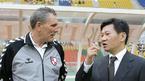 6일 부산 아시아드 주경기장에서 벌어진 FC 서울전에서 승리할 경우 삼성 하우젠 K-리그 2005 전기리그 우승을 확정짓는 부산 아이파크의 정몽규 구단주가 경기장을 찾아 이안 포터필드 감독과 이야기를 나누고 있다./부산=손용