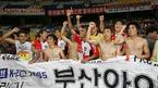 10일 부산에서 벌어진 부산 아이파크와 대전 시티즌의 전기리그 마지막 경기 부산과 대전이 1-1로 비기며 부산이 전기리그 우승을 차지했다. 선수들이 미리 준비해 둔 플래카드를 앞에 놓고 우승의 기쁨을 즐기고 있다./부산=손