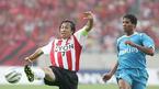 13일 인천 문학구장에서 열린 PSV 아인트호벤과 고려대 OB 프로올스타의 친선 경기서 히딩크 감독이 이끄는 아인트호벤이 1-0으로 이겼다. 후반 고려대 올스타의 김대의가 몸싸움을 벌이다 안 넘어지려 안간힘을 쓰고 있다./인천=