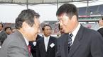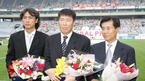 13일 인천 문학구장에서 열린 PSV 아인트호벤과 고려대 OB 프로올스타의 친선 경기에 앞서 고려대 출신인 김정남 울산 현대 감독, 차범근 수원 삼성 감독, 홍명보 대한축구협회 이사(오른쪽으로부터)가 나란히 기념패와 꽃다발을