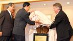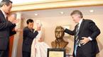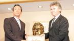 오는 15일 개막되는 피스컵 2005 코리아 대회에 참가하기 위해 지난 12일 내한한 히딩크 아인트호벤 감독이 13일 정몽준 대한축구협회장(왼쪽)과 서울 소공동 롯데호텔에서 오찬을 함께 했다. 히딩크 감독이 자신의 흉상 앞에서 정