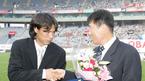 13일 인천 문학구장에서 열린 PSV 아인트호벤과 고려대 OB 프로올스타의 친선 경기에 앞서 고려대 출신인 차범근 수원 삼성 감독과 홍명보가 기념패와 꽃다발을 받은 후 서로 악수를 나누고 있다./인천=손용호 기자 spjj@osen.co.kr [C