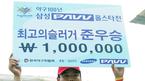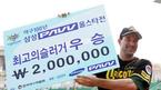2005 삼성 PAVV 올스타 전야제가 15일 인천 문학구장에서 열렸다. 올스타 투수 최고의 슬러거를 뽑는 이벤트서 준우승을 차지한 한화의 문동환이 150만원의 상금판을 들어보이고 있다. /인천=주지영 기자 jj0jj0@osen.co.kr [Copyright ⓒ OS