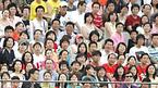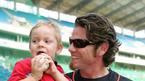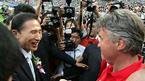 2005 삼성 PAVV 올스타 전야제가 15일 인천 문학구장에서 열렸다. 롯데의 라이온이 "김치"라고 말하자 아버지와는 달리 금발인 꼬마 아들이 따라하고 있다./인천=주지영 기자 jj0jj0@osen.co.kr [Copyright ⓒ OSEN(www.osen.co.kr) 무단전