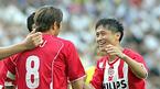피스컵 2005 코리아 대회가 15일 서울 상암 월드컵경기장에서 성남 일화와 PSV 아인트호벤의 경기로 개막됐다. 전반 아인트호벤의 필립 코쿠(가운데)가 선제골을 넣은 뒤 호베르트(왼쪽) 등과 좋아하고 있다./상암=손용호 기자 spjj@