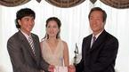 프랑스리그 FC 메츠로 이적한 안정환 부부가 15일 서울 소공동 롯데호텔에서 정몽준 대한축구협회장과 오찬을 함께 했다. 이 자리에서 정 회장이 안정환에게 를 선물로 주고 있다. 정 회장은 박지성이 협회를 예방했을 때도 같은