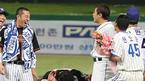 지난달 은퇴한 뒤 16일 인천 문학구장에서 벌어진 2005 삼성 PAVV 프로야구 올스타전에 특별 초청 선수로 출전, 9회초 2사 1,2루서 대타로 나와 내야 땅볼로 그친 장종훈(한화)을 경기 후 후배들이 헹가래치고 있다./인천=손용호 기