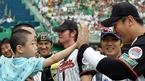 16일 인천 문학구장에서 벌어진 2005 삼성 PAVV 프로야구 올스타전서 동군이 서군에 6-5로 역전승했다. 경기 전 식전행사에서 정수근의 아들이 이대호와 하이파이브를 하고 있다./인천=손용호 기자 spjj@osen.co.kr [Copyright ⓒ OSEN(www.ose