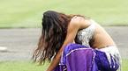 16일 인천 문학구장에서 벌어진 2005 삼성 PAVV 프로야구 올스타전에 앞서 벌어진 8개 구단 치어리더 경연에서 삼성의 한 치어리더가 벨리 댄스를 출 순서에서 입고 있던 바지가 벗겨지지 않아 고생하고 있다. /인천=손용호 기자 spj