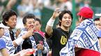 16일 인천 문학구장에서 벌어진 2005 삼성 PAVV 프로야구 올스타전에 앞서 벌어진 치어리더 경연 대회 중 LG의 이병규가 심사위원으로 나온 기아 김종국의 어깨를 주물러 주며 LG 치어리더에게 점수를 많이 달라고 부탁하고 있다./