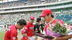 16일 인천 문학구장에서 벌어진 2005 삼성 PAVV 프로야구 올스타전에 앞서 최근 은퇴한 장종훈에 대한 공로패 시상이 있었다. 장종훈이 공로패를 받고 자리로 돌아가며 기아 이종범과 악수를 나누고 있다./인천=손용호 기자 spjj@ose