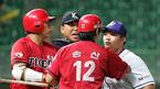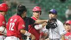 21일 인천 문학구장에서 벌어진 SK 와이번스와 기아 타이거즈의 경기 기아의 6회초 1사 2,3루 이종범의 3루 땅볼 때 협격에 걸린 3루 주자 송산(왼쪽)이 홈을 커버하던 투수 조영민(오른쪽)과 부딪쳤다. 이에 고의성이 있다고 본 조