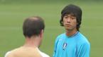 동아시아선수권대회에 나설 국가대표 선수들이 25일 오후 파주 NFC에서 더운 날씨에도 불구하고 훈련을 실시했다. 발바닥 부상으로 정규 훈련에서 제외된 박주영(오른쪽)이 미니 볼을 든 채 야스퍼트 피지컬 트레이너와 얘기를