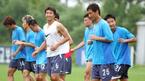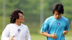 27일 오후 파주 국가대표 트레이닝 센터에서 열린 대표팀과 건국대의 연습경기에 스타팅 멤버로 출전한 뒤 중간에 교체된 이동국(오른쪽)이 유니폼 상의를 벗고 앉아 밝은 표정으로 김상식과 이야기를 나누고 있다./파주=주지