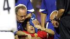 28일 도쿄 국립경기장에서 열린 맨체스터 유나이티드-가시마 앤틀러스전에서 박지성이 후반 39분께 가시마의 GK 소가하타 히토시와 충돌, 눈 부위가 찢어지는 부상을 입고 부축을 받으며 경기장 밖으로 나오고 있다. /도쿄=손용