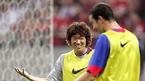 30일 일본 사이타마 경기장에서 벌어진 잉글랜드 맨체스터 유나이티드와 일본 우라와 레즈의 친선경기에 눈 주위 부상으로 결장한 박지성이 경기가 끝난 뒤 마무리 훈련 중 동료와 환한 표정으로 얘기를 나누고 있다./우라와=
