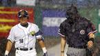 2일 두산 베어스와 LG 트윈스의 잠실경기가 두산의 8회말 1사 1,2루서 장원진의 대타 김동주 타석 때 많은 비로 잠시 중단됐다. 최규순 구심(오른쪽)이 경기를 중단시킨 뒤 김동주와 함께 그라운드를 나서고 있다./잠실=주지영 기