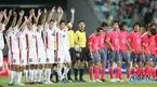 4일 전주 월드컵경기장에서 벌어진 제2회 동아시아선수권대회 한국-북한전은 0-0으로 승부를 가리지 못했다. 경기 후 하프라인에 나란히 도열한 한국 선수들이 북한 선수들이 손을 들어 인사하는 모습을 쳐다보고 있다./ 전주=손