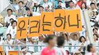 4일 2005 동아시아 여자컵 남북한의 경기가 열린 전주 월드컵경기장을 찾은 팬들이 한반도기 티셔츠 차림으로 '우리는 하나'라고 적은 플래카드를 들고 응원하고 있다./전주=손용호 기자 spjj@osen.co.kr [Copyright ⓒ OSEN(www.osen.co.kr)