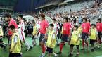4일 전주 월드컵경기장에서 벌어진 제2회 동아시아선수권대회 한국-북한전이 시작되기 앞서 양 팀 선수들이 어린이들의 손을 잡고 함께 입장하고 있다./ 전주=손용호 기자 spjj@osen.co.kr [Copyright ⓒ OSEN(www.osen.co.kr) 무단전재 및 재