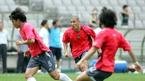 요하네스 본프레레 감독이 이끄는 한국 축구대표팀에 소집된 25명 선수들이 15일 처음으로 모두 모인 가운데 회복훈련과 전술훈련을 가졌다. J리그 시미즈 S-펄스의 조재진을 비롯해 네덜란드 PSV 아인트호벤의 이영표, 프랑스
