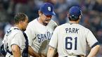 20일(한국시간) 터너필드에서 열린 애틀란타 브레이브스전에서 9-3으로 앞서 있던 6회말 1사 1, 2루에서 마운드에 오른 브루스 보치 샌디에이고 감독이 박찬호에게 공을 건네받고 있다. /애틀랜타(미국 조지아주)=news&image 특약 [Cop