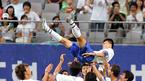 21일 서울 상암 월드컵 경기장에서 벌어진 2005삼성 하우젠 K-리그 올스타전에서 중부팀 박주영이 전반 12분 자신이 얻어낸 페널티킥을 가볍게 차 넣어 첫 골을 터뜨린 뒤 세리머리를 하기 위해 최성용의 등에 올라타고 있다./상암