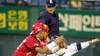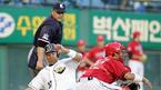 23일 두산베어스와 기아 타이거즈의 잠실 경기 두산의 8회말 1사 1,3루서 손시헌의 우익수 플라이 때 태그업한 3루 주자 나주환이 홈에 쇄도하며 슬라이딩해(위 사진) 태그 아웃되는 순간 두 손으로 세이프라는 제스처를 취하고