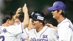 23일 문학구장에서 벌어진 SK 와이번스와 한화 이글스의 경기 SK의 9회말 2사 1,2루서 끝내기 안타를 날린 이진영(오른쪽에서 두 번째)이 동료들의 축하를 받고 있다./인천=손용호 기자 spjj@osen.co.kr [Copyright ⓒ OSEN(www.osen.co.kr) 무단