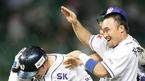 23일 문학구장에서 벌어진 SK 와이번스와 한화 이글스의 경기 SK의 9회말 2사 1,2루서 이진영(왼쪽)이 끝내기 안타를 날리자 정경배가 뒤통수를 치며 축하해 주고 있다./인천=손용호 기자 spjj@osen.co.kr [Copyright ⓒ OSEN(www.osen.co.kr) 무