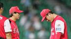 23일 문학구장에서 벌어진 SK 와이번스와 한화 이글스의 경기 1-1 동점이던 SK의 9회말 2사 1,2루서 투수 교체를 위해 최일언 투수 코치(왼쪽)가 마운드에 올라오자 선발 투수 문동환이 고개를 숙이고 아쉬워하고 있다. 문동환은 이