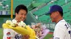 23일 문학구장에서 벌어진 SK 와이번스와 한화 이글스의 경기에 앞서 역대 19번째로 통산 2000루타를 기록한 SK 김재현에 대한 시상이 있었다. 조범현 감독이 꽃다발을 전달하고 있다. /인천=손용호 기자 spjj@osen.co.kr [Copyright ⓒ OSEN