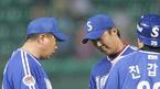 26일 문학구장에서 벌어진 SK 와이번스와 삼성 라이온즈의 경기 SK의 8회말 2사 만루서 선발 투수 배영수가 박경완을 상대로 볼카운트 2-1에서 자신없는 투구를 하자 마운드에 직접 나와 교체시킨 선동렬 삼성 감독이 포수 진갑용