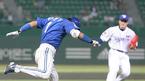 26일 문학구장에서 벌어진 SK 와이번스와 삼성 라이온즈의 경기 삼성의 9회초 무사 1루서 강동우가 1루주자를 2루로 보내기 위한 번트를 댄 뒤 공이 자신이 달리는 쪽으로 구르자 펄쩍 뛰며 피하고 있다. /인천=손용호 기자 spjj@ose