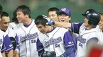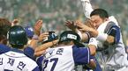 27일 문학구장에서 벌어진 SK 와이번스와 삼성 라이온즈의 경기 2-3으로 뒤지던 SK의 9회말 무사 1루서 동점 2루타를 친 뒤 최정의 내야 안타때 홈을 밟아 재역전 결승점을 올린 이호준(오른쪽에서 두 번째)을 동료들이 두드려(?) 주