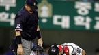 3일 잠실구장에서 벌어진 LG 트윈스와 삼성 라이온즈의 경기 5회초 무사 1,2루에서 김재걸의 번트 타구가 홈플레이트를 맞고 튀었다며 문승훈 주심이 파울을 선언하자 포수 김정민이 낙구 지점이 페어 지역이 아니냐고 손으로 가