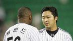 3일 잠실야구장에서 벌어진 LG 트윈스와 삼성 라이온즈의 경기서 LG가 삼성에 6-3으로 재역전승을 거뒀다.경기 후 승리투수가 되며 9연패서 탈출한 선발투수 왈론드가 세이브를 따낸 마무리 투수 경헌호(오른쪽)를 반갑게 맞이하