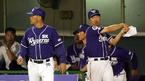 7일 SK-삼성전 4회말 삼성 공격 심정수 타석에서 강광회 1루심이 심정수의 배트가 돌지 않았다고 노스윙을 선언하자 SK 덕아웃에서 조범현 감독과 김동재 코치가 뛰쳐나오며 항의하고 있다. 김동재 코치는 심정수의 방망이가 완
