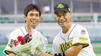 8일 현대 유니콘스와 두산 베어스의 수원 경기에 앞서 사상 첫 통산 500도루를 달성한 현대 전준호에 대한 구단의 시상 행사가 있었다. 현대 최고참인 김동수(오른쪽)가 전준호에게 축하 꽃다발을 전달하고 있다./수원원=주지영