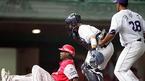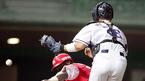 8일 문학구장에서 벌어진 SK 와이번스와 한화 이글스의 경기 한화의 3회초 1사 1,3루 이도형의 유격수 땅볼때 3루주자 데이비스가 늦게 스타트했으나 SK 유격수 김민재의 송구가 포수 박경완의 글러브를 맞고 튀며 세이프되고 있