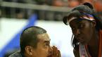 12일 서울 장충체육관에서 벌어진 신한은행배 2005 여자프로농구 여름리그 4강 플레이오프 3차전서 박명수 우리은행 감독이 경기 도중 크롤리에게 다가가 지시를 내리고 있다./장충체=주지영 기자 jj0jj0@osen.co.kr [Copyright ⓒ OSEN(www.
