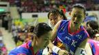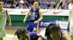 12일 서울 장충체육관에서 벌어진 신한은행배 2005 여자프로농구 여름리그 4강 플레이오프 3차전서 국민은행에 56-53으로 역전승, 2승 1패로 챔피언 결정전에 오른 신한은행의 진미정(왼쪽)이 넘어지면서 정선민과 함께 루스볼을