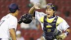 14일 두산 베어스와 SK 와이번스의 잠실 경기 SK의 4회말 1사 만루서 김태균의 스퀴즈 번트 실패 때 홈으로 스타트했던 3루 주자 이호준과 3루로 향하던 2루 주자 이진영을 모두 아웃 처리, 공수 교대가 되자 두산 포수 홍성흔(오른