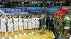 16일 안산 와동 실내체육관에서 벌어진 신한은행배 2005 여름리그 챔피언 결정전 2차전서 61-51로 승리한 신한은행 선수들이 열렬히 응원해 준 마린 아카데미 해병대 캠프 교관단과 상호 거수 경례를 주고 받고 있다./안산=주지영