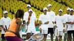 18일 올림픽 체조경기장에서 열린 테니스 스타 비너스와 샤라포바의 원포인트 클리닉에서 샤라포바가 참가 학생들과 나란히 서서 기념사진을 찍고 있다. 옆에 있는 남자 학생들이 쑥스러운 듯 웃고 있다. /손용호 기자 spjj@osen.c
