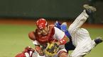22일 광주구장에서 벌어진 기아 타이거즈와 삼성 라이온즈의 경기 삼성의 2회초 1사 2,3루서 박석민의 중견수 플라이때 태그업한 3루 주자 진갑용이 블로킹하는 기아 포수 송산에 정면으로 부딪치며 세이프되고 있다. 송산은 이